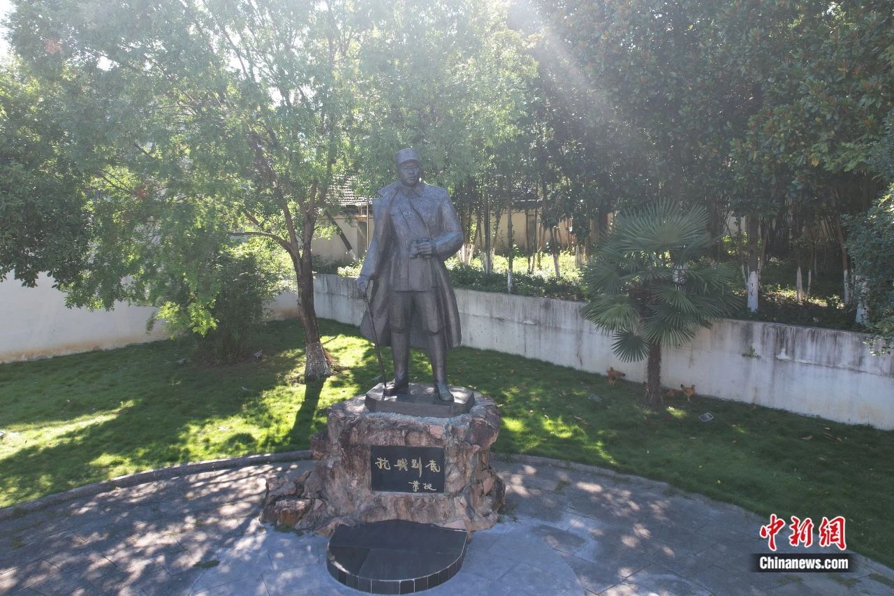 坐落在安徽泾县云岭镇新四军军部旧址前的叶挺雕像。(无人机照片)张强 摄